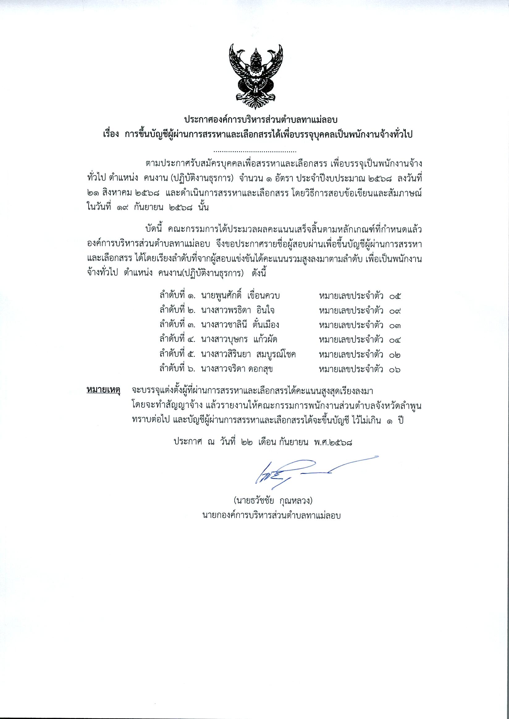 บัดนี้ คณะกรรมการได้ประมวลผลคะแนนเสร็จสิ้นตามหลักเกณฑ์ที่กำหนดแล้ว องค์การบริหารส่วนตำบลทาแม่ลอบ จึงขอประกาศรายชื่อผู้สอบผ่านเพื่อขึ้นบัญชีผู้ผ่านการสรรหาและเลือกสรร โดยเรียงลำดับจากผู้สอบแข่งขันได้คะแนนรวมสูงลงมาตามลำดับ ดังนี้
