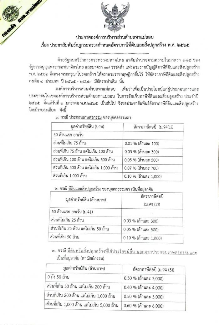 ประชาสัมพันธ์กฎกระทรวงกำหนดอัตราภาษีที่ดินและสิ่งปลูกสร้าง พ.ศ. 2565