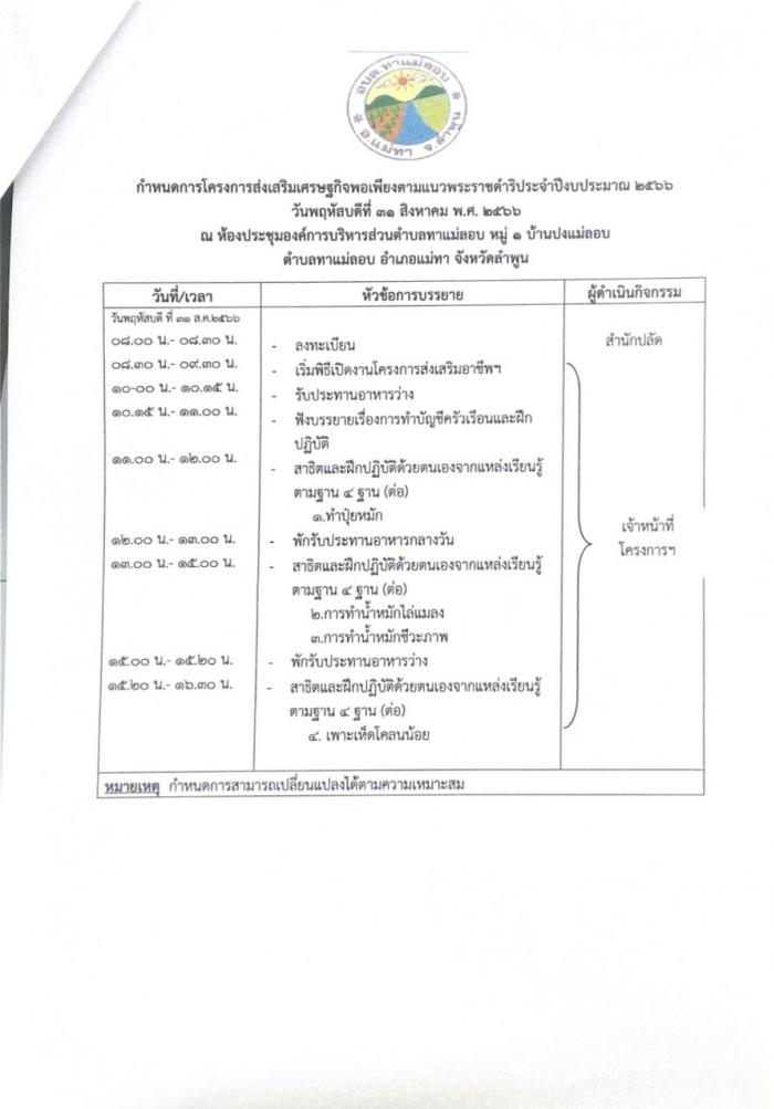 เชิญชวน ผู้ที่มีความสนใจเข้าร่วมโครงการส่งเสริมเศรษฐกิจพอเพียงตามแนวพระราชดำริประจำปีงบประมาณ 2566 สามารถเข้าร่วมได้ที่ ห้องประชุมองค์การบริหารส่วนตำบลทาแม่ลอบ วันพฤหัสบดี ที่ 31 สิงหาคม 2566 เวลา 09.30 น.