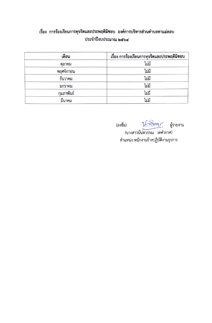 การร้องเรียนการทุจริตและประพฤติมิชอบ องค์การบริหารส่วนตำบลทาแม่ลอบ ประจำปีงบประมาณ 2564
