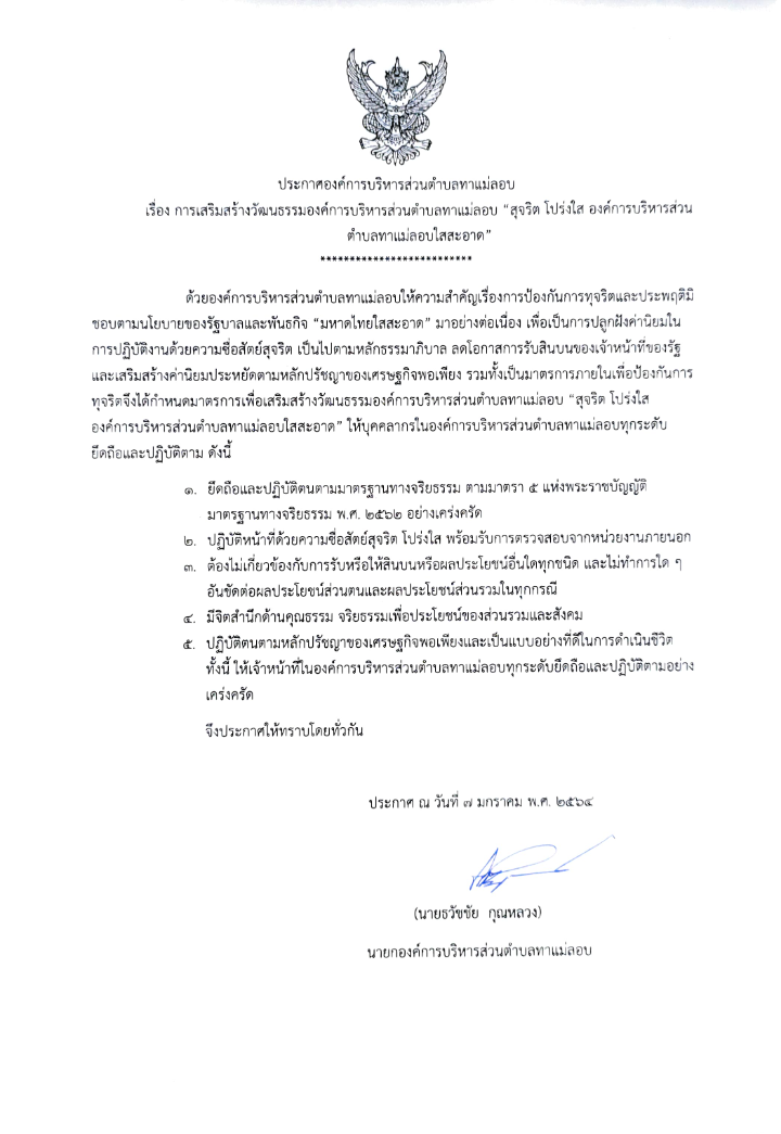การเสริมหร้างวัฒนธรรมองค์การบริหารส่วนตำบลทาแม่ลอบ สุจริต โปร่งใส องค์การบริหารส่วนตำบลทาแม่ลอบใสสะอาด