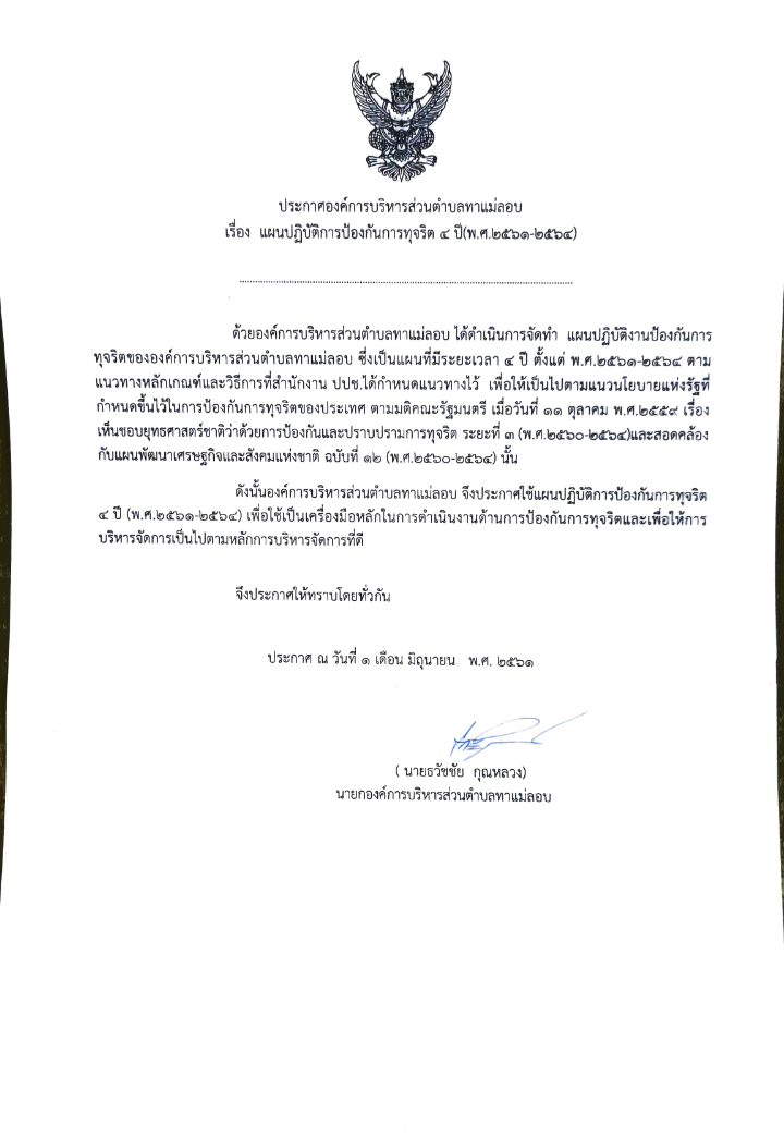 แผนปฏิบัติการป้องกันการทุจริตเพื่อยกระดับคุณธรรมและความโปร่งใสขององค์การบริหารส่วนตำบลทาแม่ลอบ(พ.ศ.2566-2570)