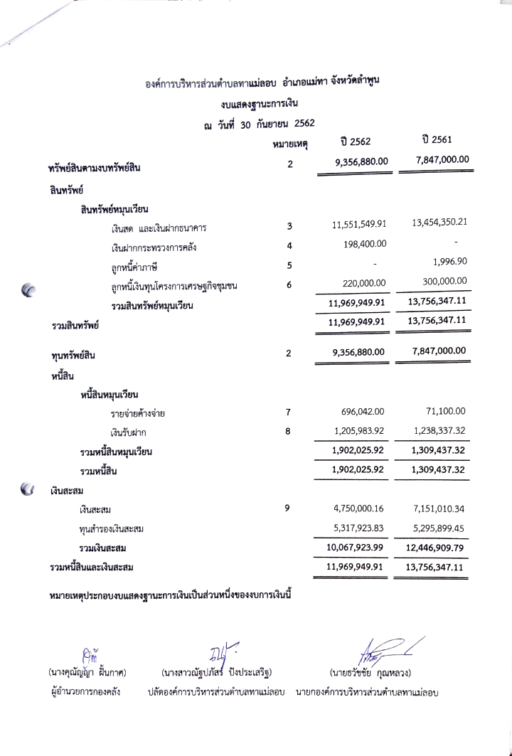 ประกาศองค์การบริหารส่วนตำบลทาแม่ลอบ เรื่อง รายงานงบแสดงฐานะการเงินและงบอื่น