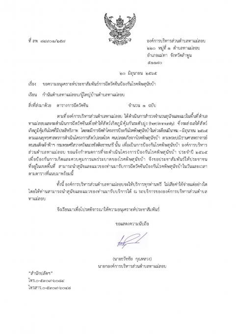 ประชาสัมพันธ์ ตารางการฉีดวัคซีน พิษสุนัขบ้า องค์การบริหารส่วนตำบลทาแม่ลอบ