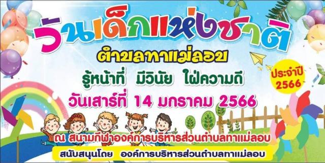 องค์การบริหารส่วนตำบลทาแม่ลอบ มีกำหนดจัดกิจกรรมวันเด็กแห่งชาติประจำปีงบประมาณ 2566 จึงอยากเชิญพ่อแม่ ผู้ปกครองพาเด็กๆ ในพื้นที่ตำบลทาแม่ลอบ และตำบลใกล้เคียงมาร่วมสนุกกับกิจกรรมมากมายภายในงานวันเด็กแห่งชาติ ปี 2566 ณ สนามกีฬาตำบลทาแม่ลอบ อำเภอแม่ทา จังหวัดลำพูน