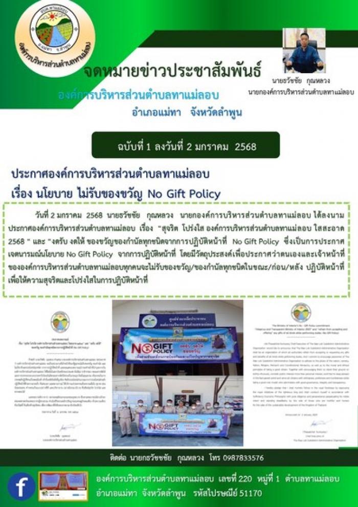 จดหมายข่าวประชาสัมพันธ์ องค์การบริหารส่วนตำบลทาแม่ลอบ ฉบับที่ 1 เรื่อง นโยบาย ไม่รับของขวัญ No Gift Policy