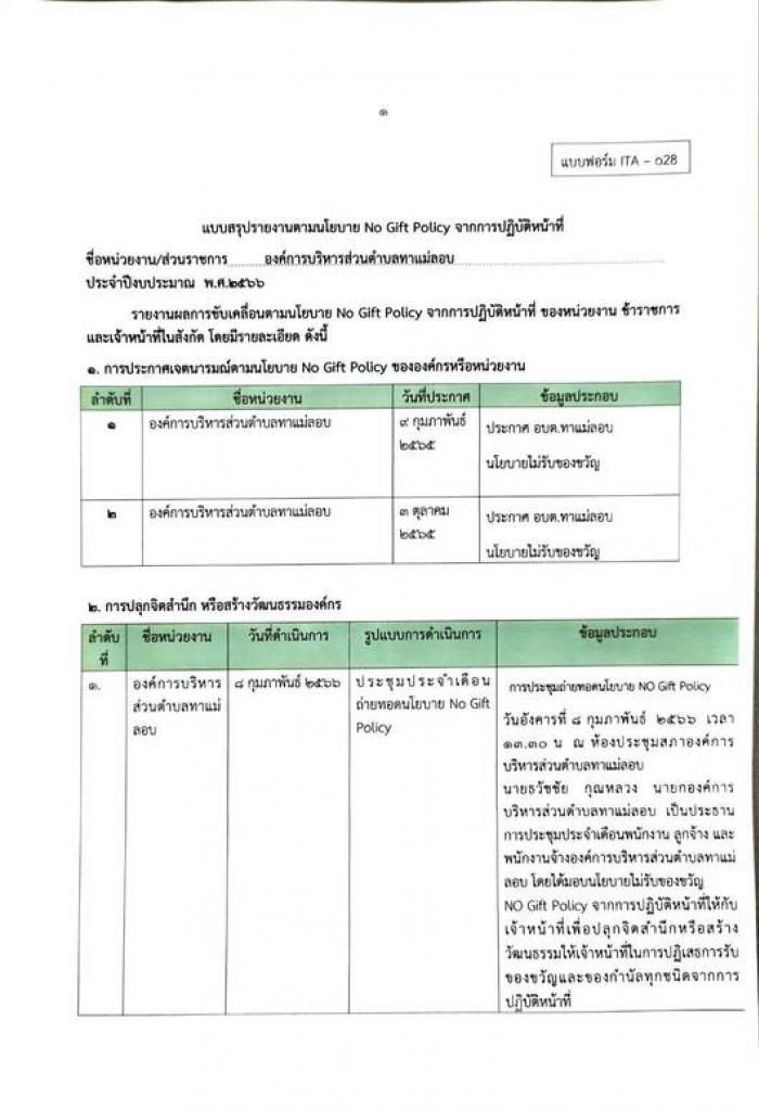 สรุปรายงานการรับของขวัญและของกำนันจากการปฏิบัติหน้าที่ตามนโยบาย No Gift Policy ประจำปีงบประมาณ พ.ศ.2566