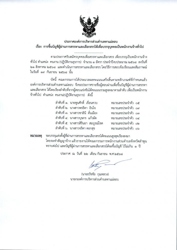 บัดนี้ คณะกรรมการได้ประมวลผลคะแนนเสร็จสิ้นตามหลักเกณฑ์ที่กำหนดแล้ว องค์การบริหารส่วนตำบลทาแม่ลอบ จึงขอประกาศรายชื่อผู้สอบผ่านเพื่อขึ้นบัญชีผู้ผ่านการสรรหาและเลือกสรร โดยเรียงลำดับจากผู้สอบแข่งขันได้คะแนนรวมสูงลงมาตามลำดับ ดังนี้