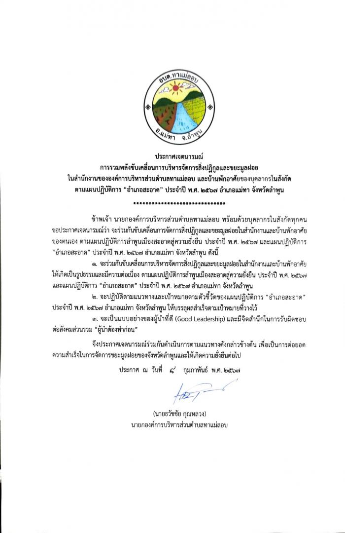 องค์การบริหารส่วนตำบลทาแม่ลอบ ประกาศเจตนารมณ์การรวมพลังขับเคลื่อนการบริหารจัดการสิ่งปฏิกูลและขยะมูลฝอย ในสำนักงาน และบ้านพักอาศัยของบุคลากรในสังกัด องค์การบริหารส่วนตำบลทาแม่ลอบ