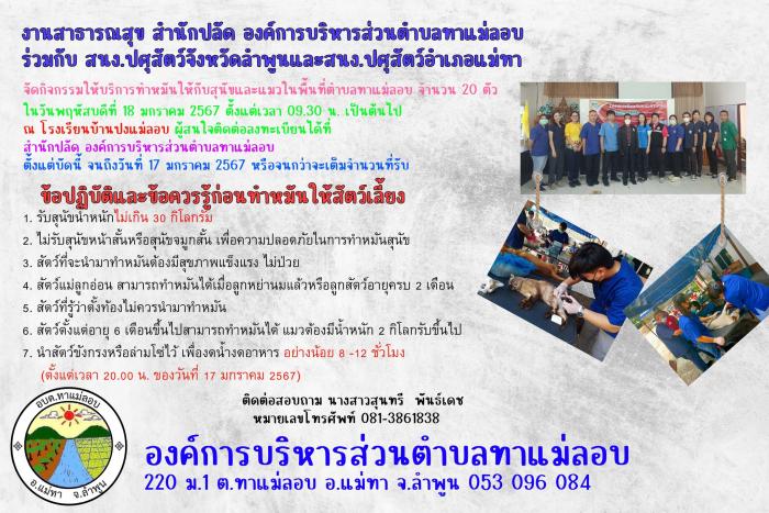 องค์การบริหารส่วนตำบลทาแม่ลอบ ร่วมกับสนง.ปศุสัตว์อำเภอแม่ทา และสนง.ปศุสัตว์จังหวัดลำพูน จัดกิจกรรมให้บริการทำหมันให้กับสุนัขและแมวในพื้นที่ตำบลทาแม่ลอบ