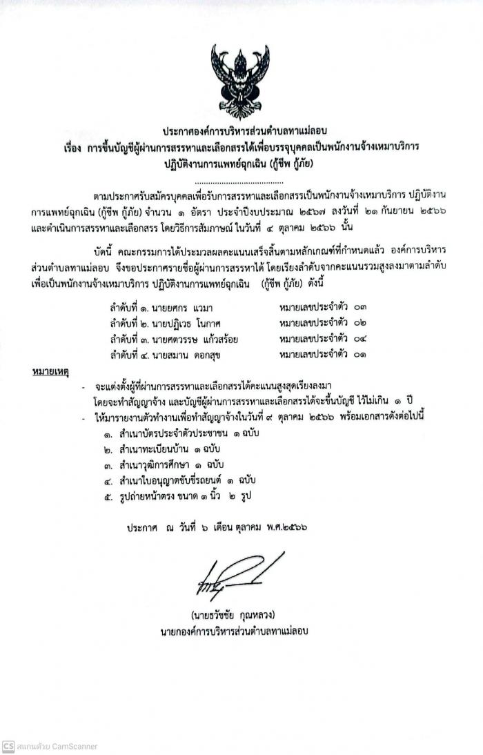 ประกาศรายชื่อผู้ผ่านการสรรหา เพื่อแต่ตั้งเป็นพนักงานจ้างเหมาบริการ ปฏิบัติงานการแพทย์ฉุกเฉิน(กู้ชีพ กู้ภัย)