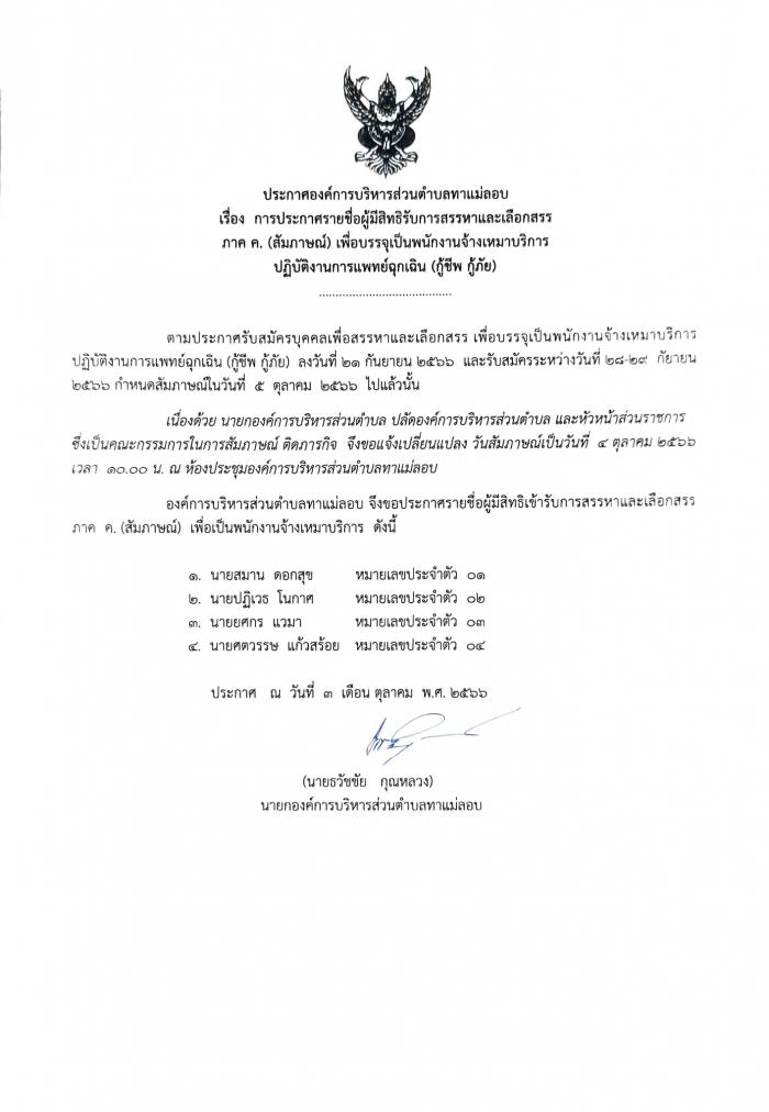 การประกาศรายชื่อผู้มีสิทธิรับการสรรหาและเลือกสรร ภาค ค. (สัมภาษณ์) เพื่อบรรจุเป็นพนักงานจ้างเหมาบริการ ปฏิบัติงานการแพทย์ฉุกเฉิน(กู้ชีพ กู้ภัย)