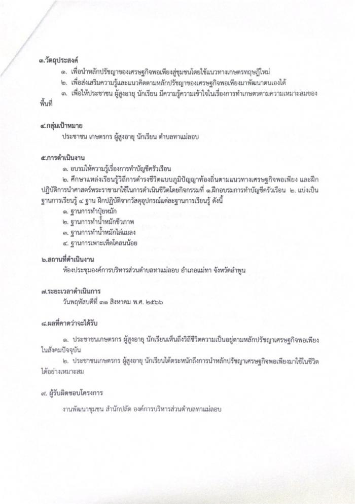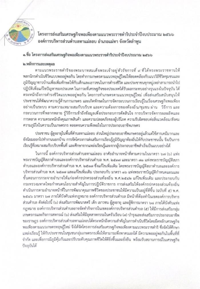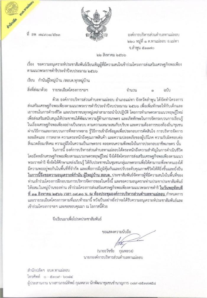 เชิญชวน ผู้ที่มีความสนใจเข้าร่วมโครงการส่งเสริมเศรษฐกิจพอเพียงตามแนวพระราชดำริประจำปีงบประมาณ 2566 สามารถเข้าร่วมได้ที่ ห้องประชุมองค์การบริหารส่วนตำบลทาแม่ลอบ วันพฤหัสบดี ที่ 31 สิงหาคม 2566 เวลา 09.30 น.