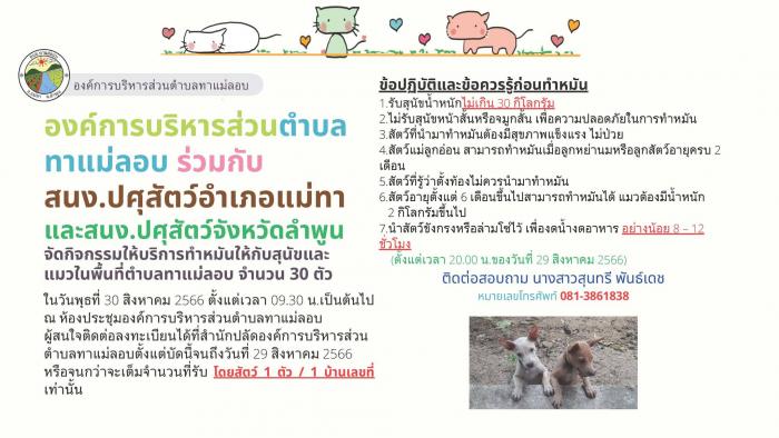 กิจกรรมให้บริการทำหมันให้กับสุนัขและแมวในพื้นที่ตำบลทาแม่ลอบ จำนวน 30 ตัว