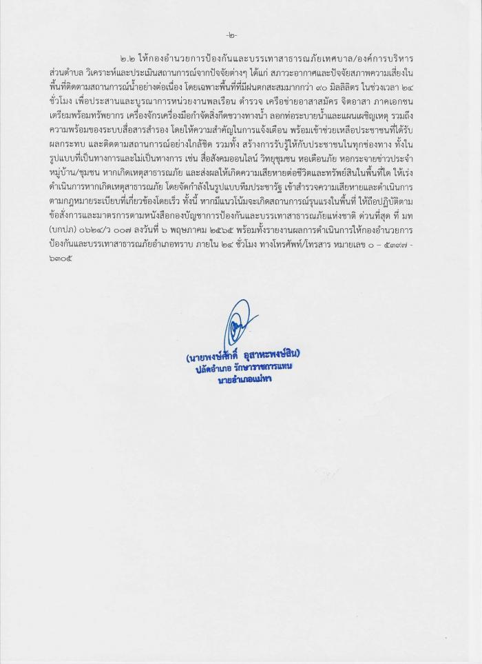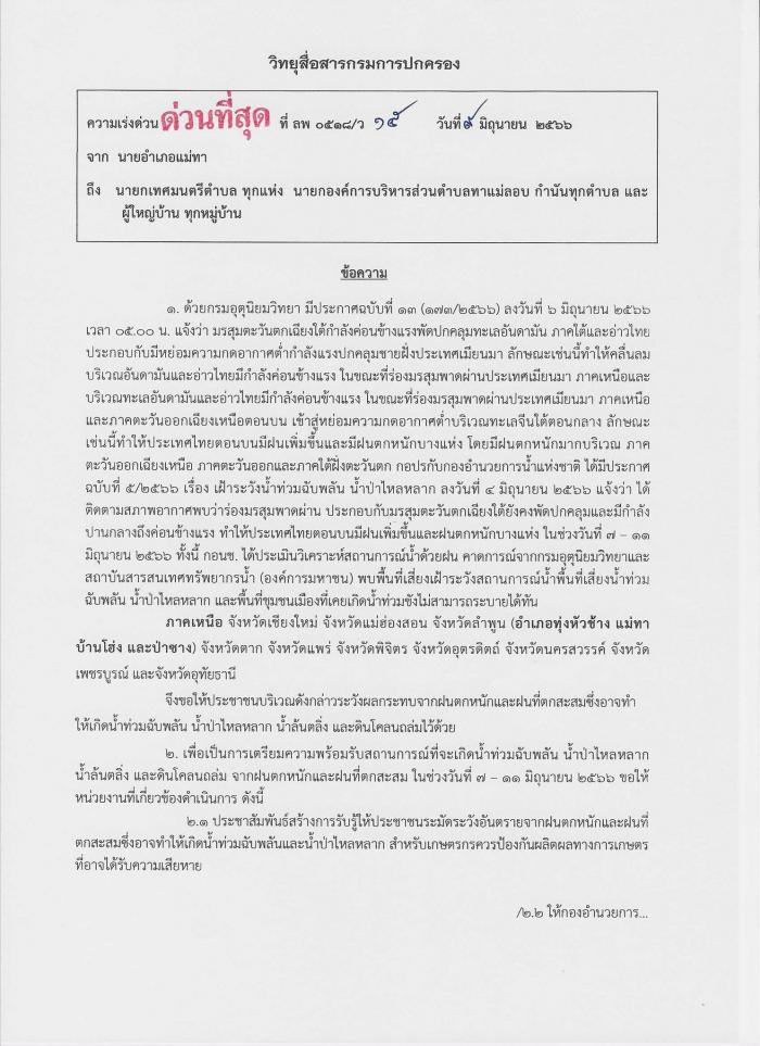 เตรียมความพร้อมรับสถานการณ์ที่จะเกิดน้ำท่วมฉับพลัน น้ำป่าไหลหลาก น้ำล้นตลิ่ง และดินโคลนถล่ม จากฝนตกหนักและฝนที่ตกสะสม ในช่วงวันที่ 7 - 11 มิถุนายน 2566