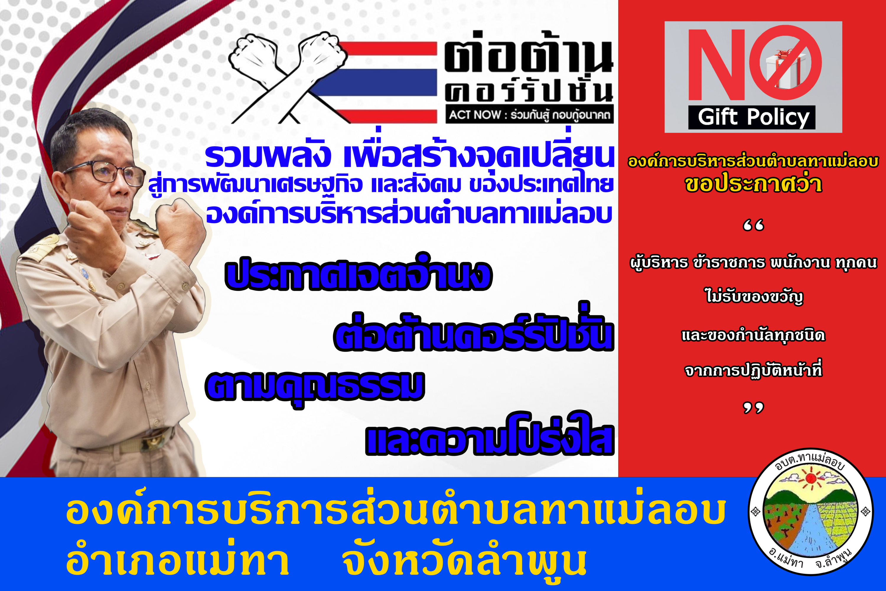 ประกาศเจตนารมณ์ เรื่อง "สุจริต โปร่งใส องค์การบริหารส่วนตำบลทาแม่ลอบ ใสสะอาด 2568 " และ "งดรับ งดให้" ของขวัญ ของกำนัลทุกชนิดจากการปฏิบัติหน้าที่ (No Gift Policy)